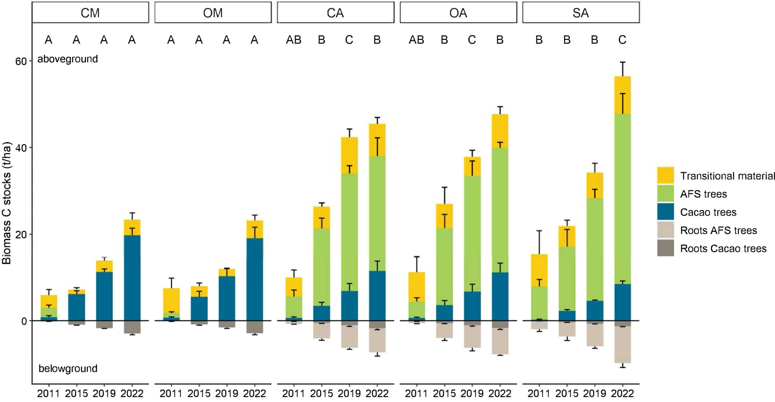 More than 70% of the stored carbon came from shade and companion trees, showing that mimicking natural forest succession is the key to turning cocoa farming into a reforestation strategy.